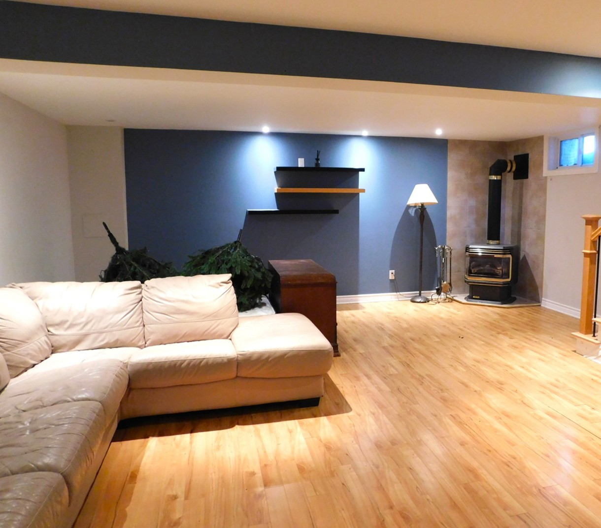 Description : Grand sous-sol équipé d’un poêle au bois, qui peut accueillir une chambre et un salon